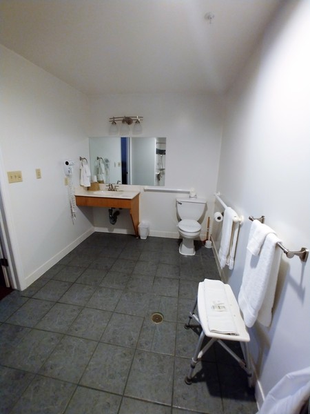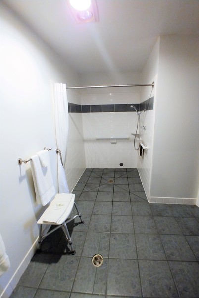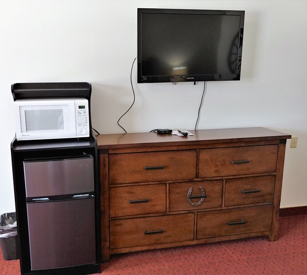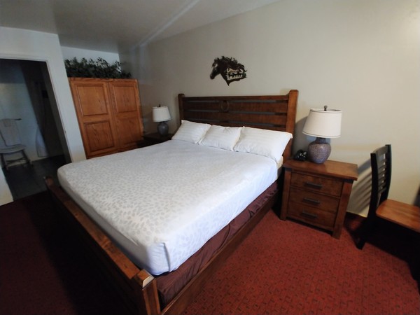 Handicap Accessible (ranch style) room with one king bed, roll-a-way beds and cribs available upon request, microwave, refrigerator, large comfortable chair with ottoman, individual room heating and cooling controls, phone (local calls are free), complimentary cable TV, bathroom has either large open shower that is wheel chair accessible or tiled step in shower with a large built in seat, hair dryer available upon request, and iron/ironing board available upon request.