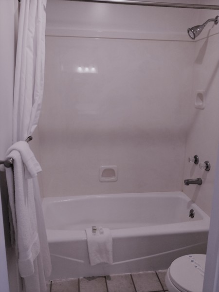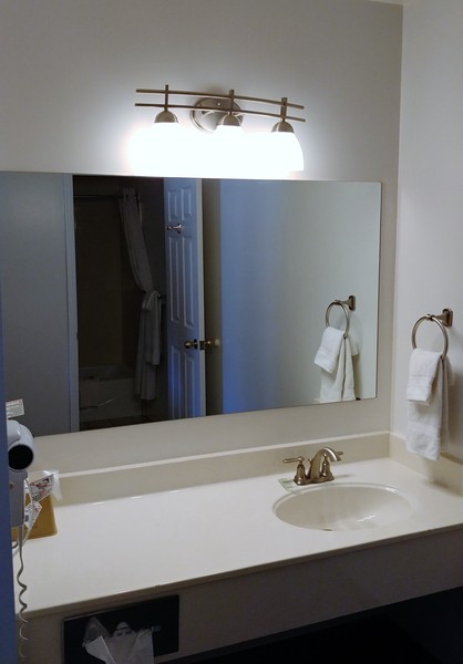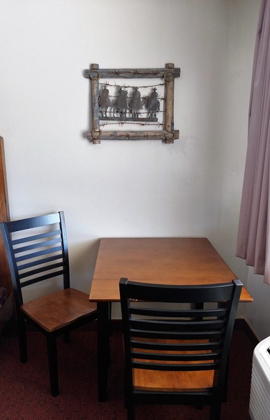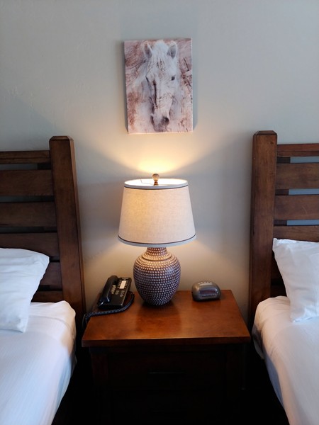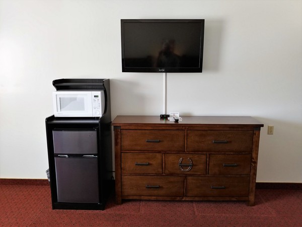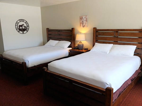 Ranch Style Room with two double queen beds, roll-a-way beds and cribs available upon request, microwave, refrigerator, large soft chair and ottoman, individual room heating and cooling controls, phone (local calls are free), complimentary cable TV, vanity and sink are separate from bathing area, hair dryer, and iron/ironing board available upon request.